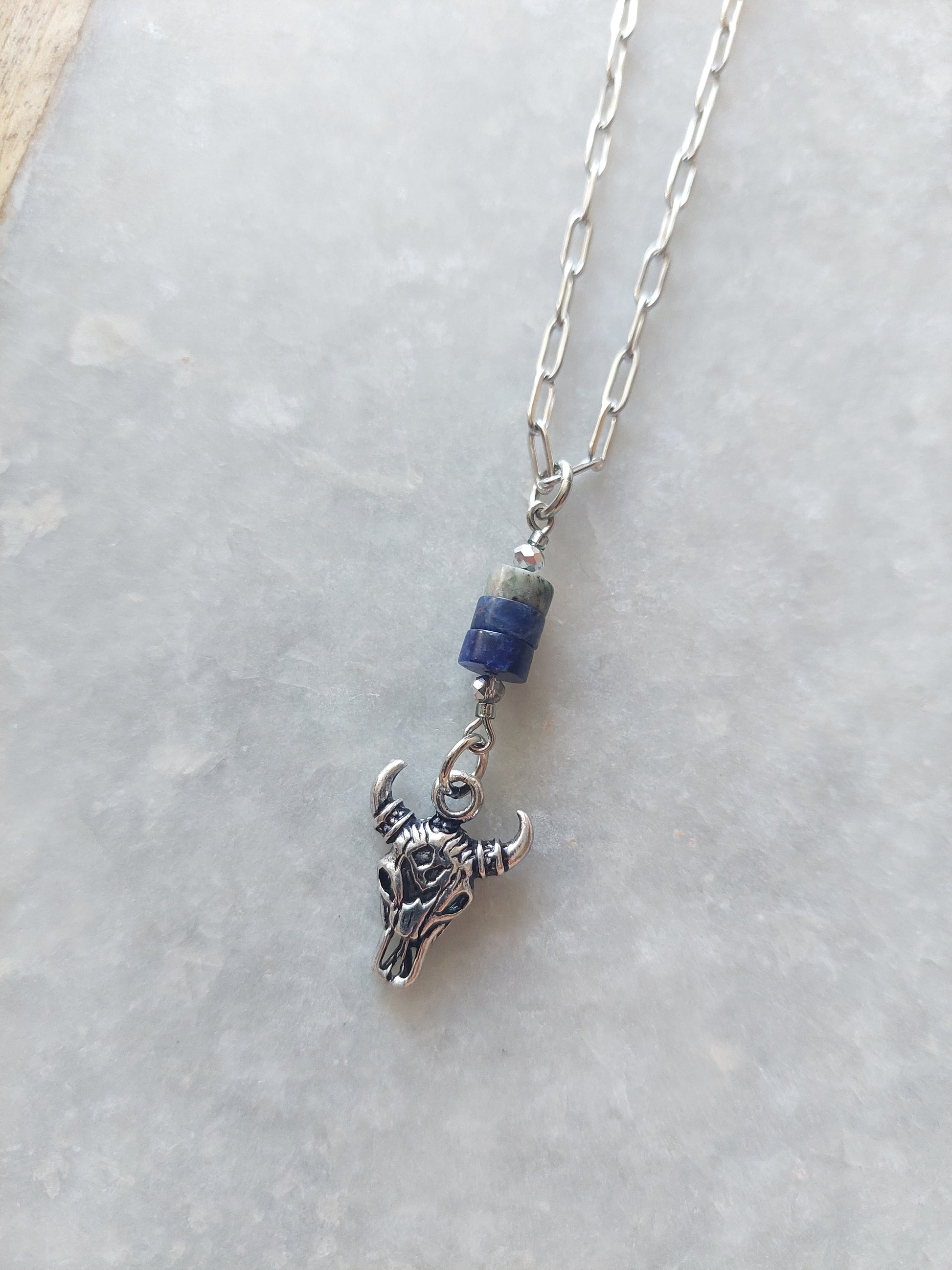 Lapis Lazuli pairs with this pewter bull skull on a paperclip chain.