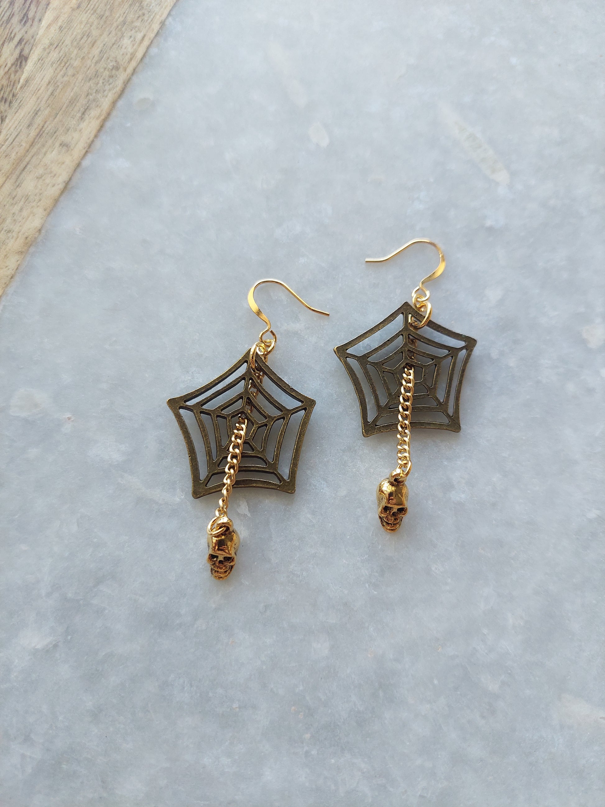 Antique Brass Plated Spiderweb (2); Skull Bead (2)